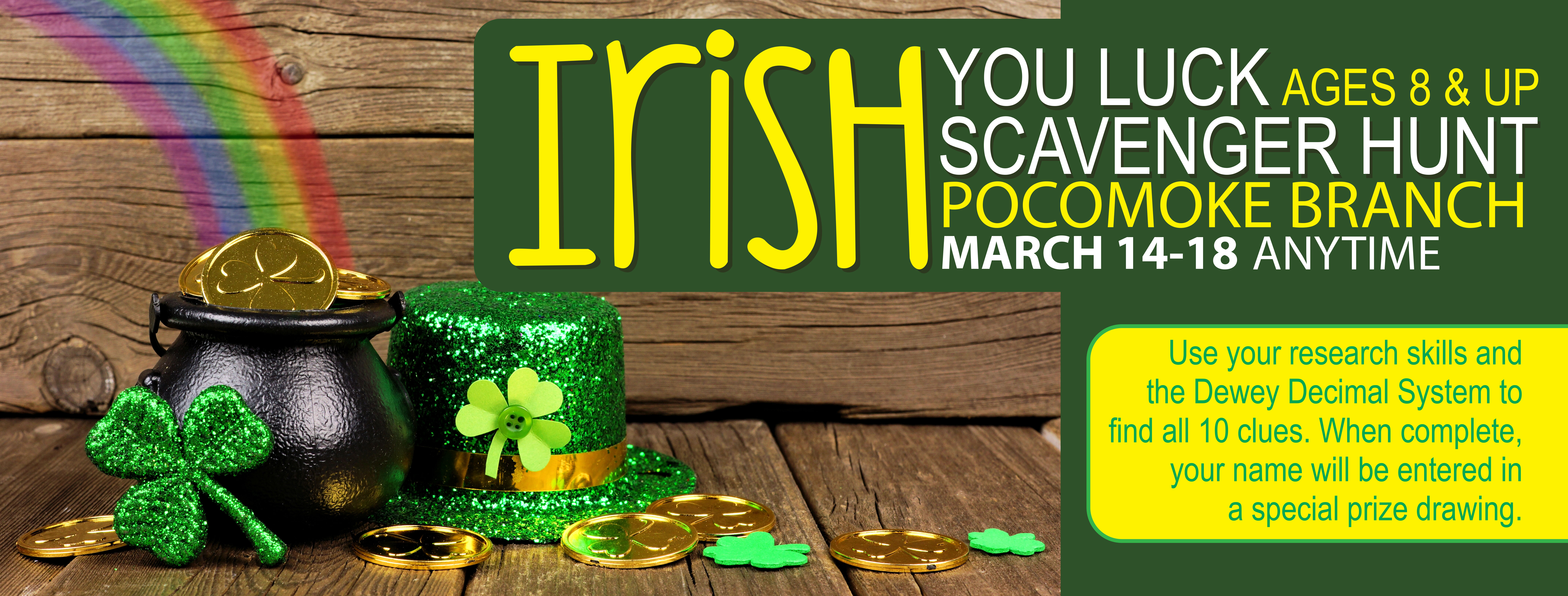 Come in any day this week to participate in our Irish-themed scavenger hunt. Use your research skills and the Dewey Decimal System to find all 10 clues. When complete, your name will be entered in a special prize drawing.  Ages 8 and up. (Younger children may need help from an adult.)